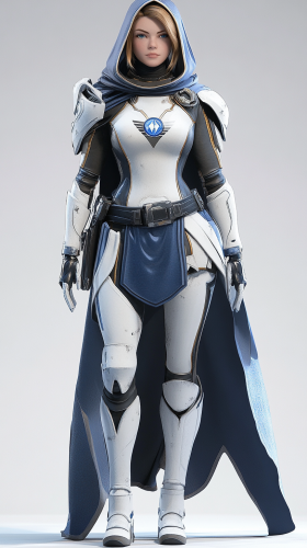 Disney style 3D animation, original character, sci-fi heroine, Destiny 2 female Hunter, Disney sci-fi space princess, short light brown hair, blue eyes, white and blue armor, flowing cloak and hood, full-body --ar 9:16