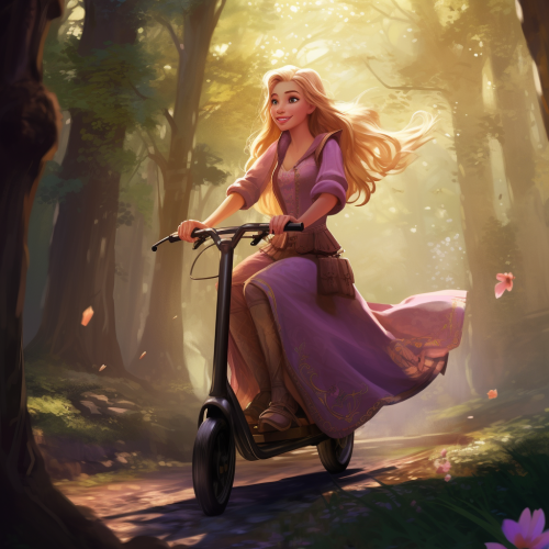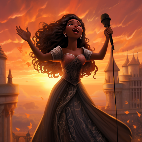 Create a Disney Princess from profile with brown hair and eyes, heart from little pink light in her hand, background should be turquoise blue and yellow, purple, pink, magenta, blur light, very colorful, very cute magical forest blue. --ar 3:4 --v 6.1