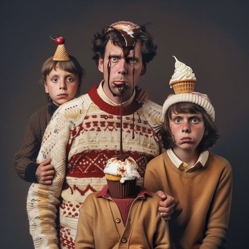 "Create an image of a character resembling Beetlejuice wearing a knitted ugly Christmas sweater. The sweater should have fun, tacky holiday patterns like snowflakes, reindeer, and candy canes in bright, clashing colors. Keep Beetlejuice’s wild, eccentric look with his messy hair and striped suit visible under the sweater. Capture a humorous, festive vibe, with detailed textures on the knitted sweater and Beetlejuice’s mischievous expression."