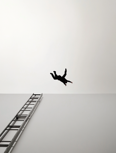High-definition photo from a rooftop perspective looking downward. A metal ladder extends down from the edge of the roof to the ground below. On the ground, a human is lying flat in a humorous and exaggerated pose, as if they have just fallen. The scene should capture the view from the roof, with the ladder prominently in the foreground and the human visible below. The background is a plain white backdrop with no shadows, maintaining a clean and isolated look that emphasizes the perspective from the rooftop down to the ground. --ar 3:4