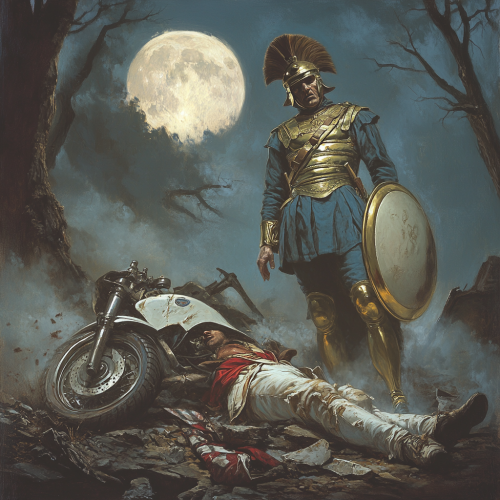 A spectral figure dressed as a Roman Spartan soldier stands tall and imposing over a fallen American patriot, who bears a striking resemblance to George Washington. The patriot, in his blue military coat, white breeches, and tri-corner hat, lies on the ground next to a crashed white racing motorcycle, the back wheel still spinning. His face, a mirror image of Washington’s, shows a mix of shock and defeat as his hat rests beside him. The ghost, now wearing a Roman Spartan’s armor--complete with a plumed helmet, leather straps, and a bronze chest plate--glows with an otherworldly light. His hollow eyes stare down with a cold, unfeeling gaze, one hand gripping a ghostly spear while a translucent shield rests at his side. Mist swirls around his feet as the full moon casts a pale glow over the battlefield, where fragments of war--broken flags, shattered cannons, and ancient ruins--litter the landscape. The fog and moonlight enhance the chilling, supernatural tension of the encounter