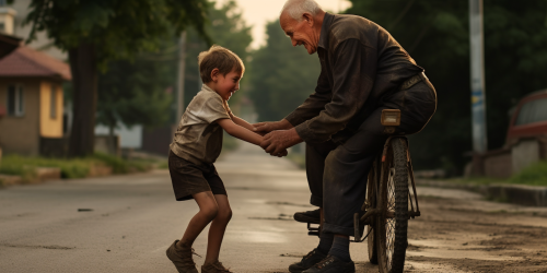a six year old boys helps a grandpa to stand up from the street after he fell from his bycicle in the town of panagyurishte in bulgaria --v 5.2 --ar 2:1
