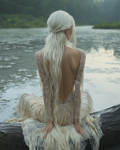 cinematic still, full body with legs shot from behind, of a young woman sitting on log, slimey gummies, skin, 28 years old, white hair, lace dress, open flowy, plussized --s 800 --ar 4:5 --v 6.1