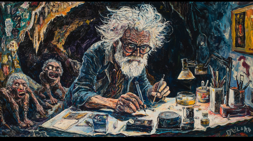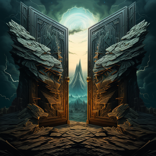 This cover shows the cyborg climbing the steep side of a craggy mountain. The sky above is a tumultuous blend of dark clouds and swirling vortexes. Clutched in the cyborg's grip is the staff, now extending towards the sky, channeling a beam of light that begins to part the clouds. The dramatic contrast of dark mountain shadows and the bright light from the orb creates a powerful visual of struggle and hope. The predominant colors are dark grays and flashes of white light. --s 250