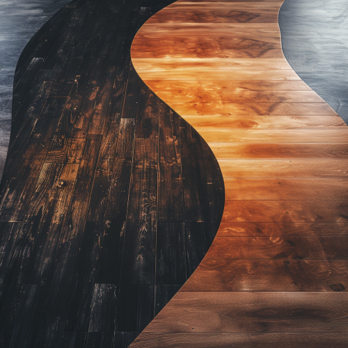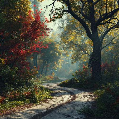 A forked road diverging into two paths. The left path is full of light, growth, and color. The right path is mundane, gloomy, and dark. The rendering should be 4k, perfect details, 16:9 aspect --v 6.0