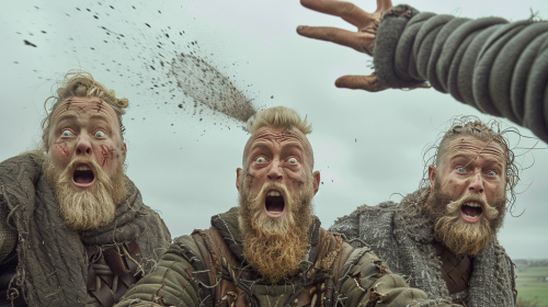 3 viking acting shocked and curious and dumb, they are looking directly at the camera, an old womans hand sweeping across the frame striking each viking, one has abrown beard, one a blond beard the otehr has none, the sky is overcast behind them, in slow motion so their faces are being pushed and it looks funny, their mouths out of wack, so spit flying, we only see her arm that is covered in grey wool --no text --ar 16:9 --style raw --v 6.0
