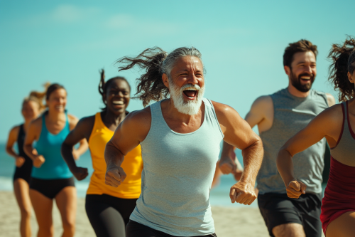 a group of diverse people, exercising outdoors, perhaps on a beach, or in an outdoor facility, but having fun, the sense of group is clear, and it is inclusive --ar 3:2