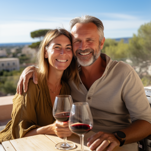 Photo image parameters 16:9 of a happy couple, a man and a woman, approximately 40 years old, on an open terrace, against the backdrop of Provence, with a glass of wine, close-up, extreme detail, healthy mood - 8k resolution, 6.0,