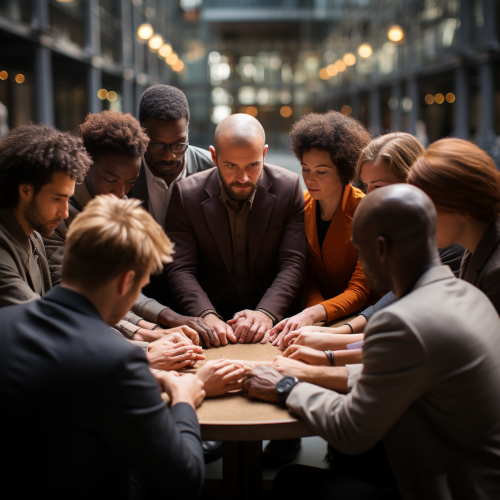 Generate a digital art for A digital art scene showing a diverse group of employees in a modern office setting, actively listening and engaging with each other. The background should be a sleek, contemporary office with large windows and natural light. Use shades of black for the overall color scheme, ensuring the scene feels professional and inclusive. No text should be present in the image. --ar 1:1