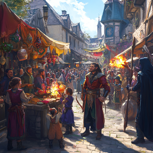 A lively scene inside a bustling medieval tavern, filled with various D&D races and characters. In the foreground, a burly half-orc bartender with piercings and blue eyes is pouring a large tankard of ale, while a group of rowdy human and dwarven patrons cheer and laugh at a nearby table. A cloaked elven rogue sits quietly in the shadows, eyeing the room suspiciously, while a flamboyantly dressed halfling bard strums a lute in the corner, entertaining a crowd of mixed races, including a tiefling, dragonborn, and gnome. The background shows a crackling fireplace and a bar with shelves stacked with bottles and kegs. The atmosphere is warm but chaotic, with tavern wenches carrying trays of food, and a couple of patrons gambling with dice at another table. The art style should reflect a classic D&D fantasy feel, with rich details, vibrant colors, and dramatic lighting, capturing the energy and diversity of a typical adventurer's gathering spot.