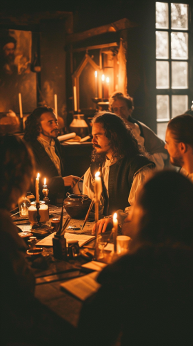 A photo of a group of writers like Shakespeare from that era, gathered in a dimly lit Elizabethan tavern. Quills in hand, engaged in animated discussion, surrounded by scrolls and ink pots. Taken on: vintage film camera, warm ambient lighting, rich earthy tones, 1:1 --ar 9:16 --v 6.0
