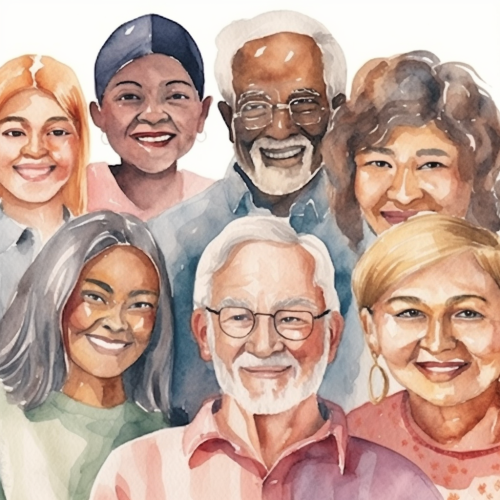 illustration of a group diverse people at a voting ballot box, positive and inspiring photo. White people, brown skinned, black skinned, etc Unified feeling. Reds and blues