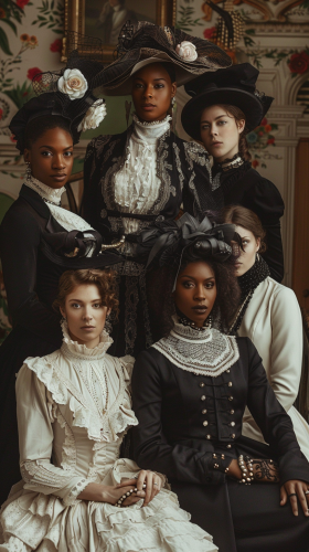 A group of diverse and elegantly dressed women from the early 1900s, representing the employees of Mahogany Hall. The composition should highlight their beauty and diversity, appearing as a genuine historical photo. --v 6.0 --ar 9:16