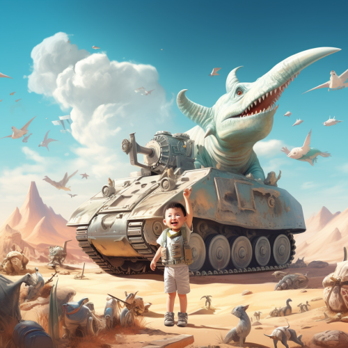 a desert child standing in front of a tank giving the thumbs up with unicorns flying around