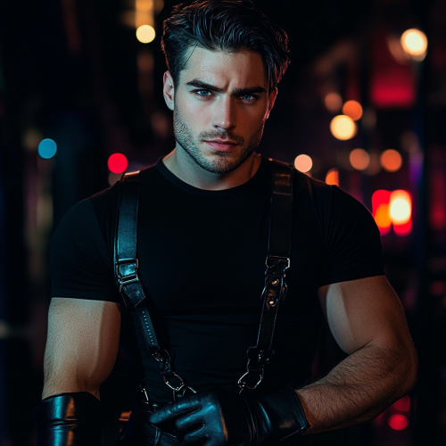 realistic photographer a man, very handsome, dark hair and blue eyes, serious and mischievous look, dressed in black trousers, black t-shirt and black suspenders, men's fingerless leather gloves to motorbiker, in a nightclub
