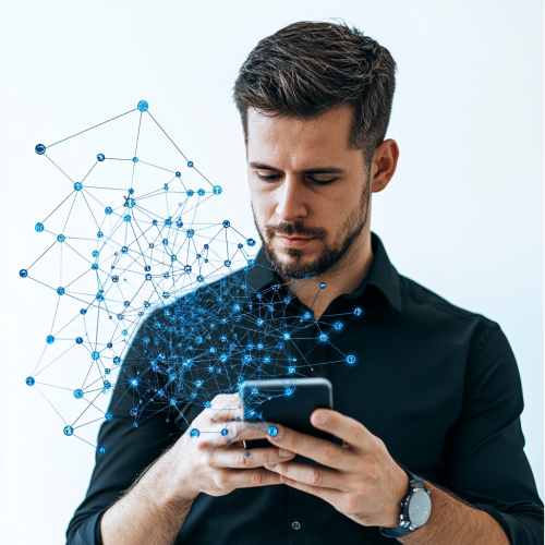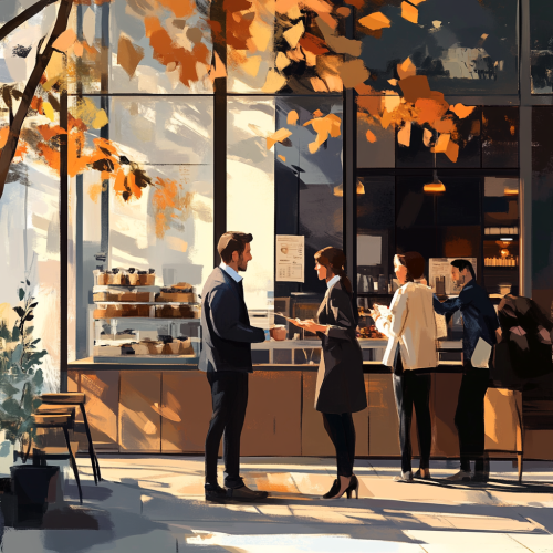 Make a realistic illustration of a person with a male profile dressed in work clothes interacting outside the office environment with colleagues in a coffee shop