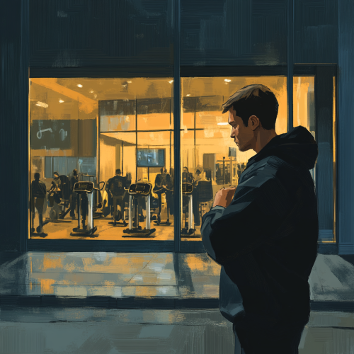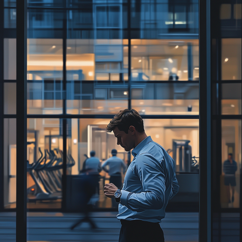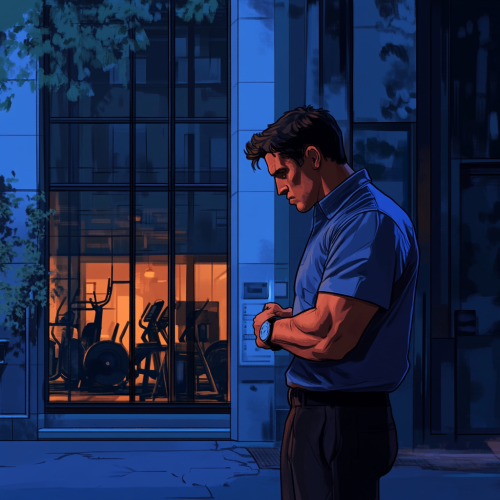 it is evening. we see the side profile of a man in work clothes disappointedly looking at his watch in the street, behind him is an inviting looking gym. it looks full through the window. --v 6.1