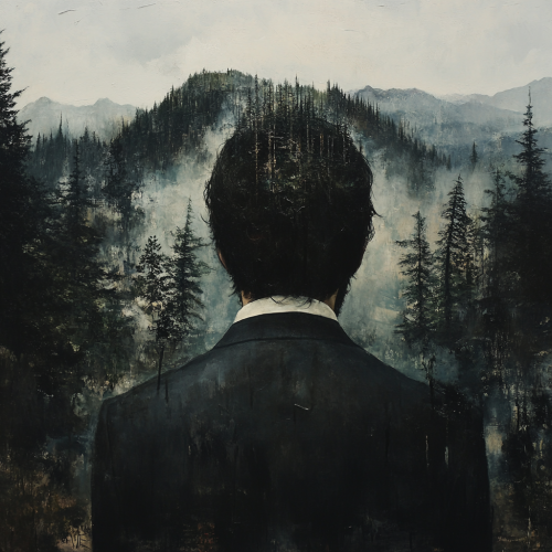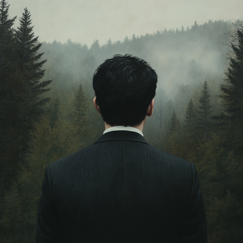 realistic front view of a black haired and beared 40 years old man, wearing a suit, half of his face could seen, looking to a deep forest deep from a high mountain