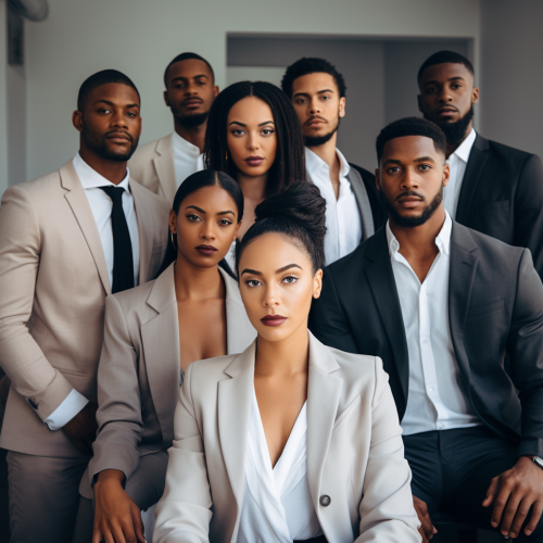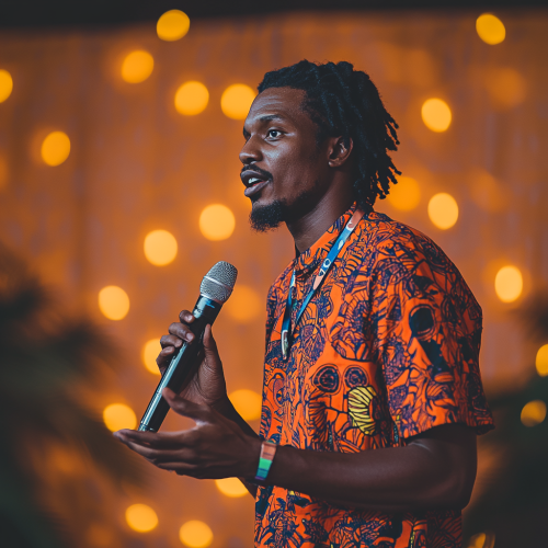 wide shot of a black african man speaking with a microphone at an event, full body, backdrop, hyperrealistic, 4k, Cinematic, Shot on 25mm lens, Shutter Speed 1/1000, F/22, 32k, Super-Resolution, Megapixel, best quality, insanely detailed and intricate, vibrant and orange feel, bokeh feel background