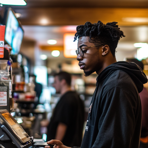 a young black man waiting at smoke shop waiting in line frustrated and unsatisfied almost cheated looking at a menu to expensive with a bunch of angry people behind him in line and a bird as cashier
