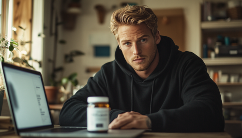 A handsome man with blonde hair wearing a black hoodie is sitting at a desk in front of a MacBook and a supplement powder jar on his desk, with a serious expression. The photography is professional, with professional lighting and color grading. The lens used is a 20mm, capturing a full-body shot with a wide-angle perspective. --ar 128:73 --s 250