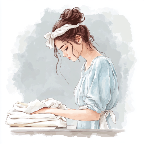 high detailed watercolor clipart of a beautiful girl folding laundry, dark thick long hair pulled into a bun and tied with a white headband in a bow, beautiful soft makeup, standing at a table folding laundry, a pile of laundry folded half horizontally next to her, wearing a comfortable home clothes, side view, the whole silhouette can be seen, soft white colors, beautiful illustrations with realistic details, high resolution, gray background