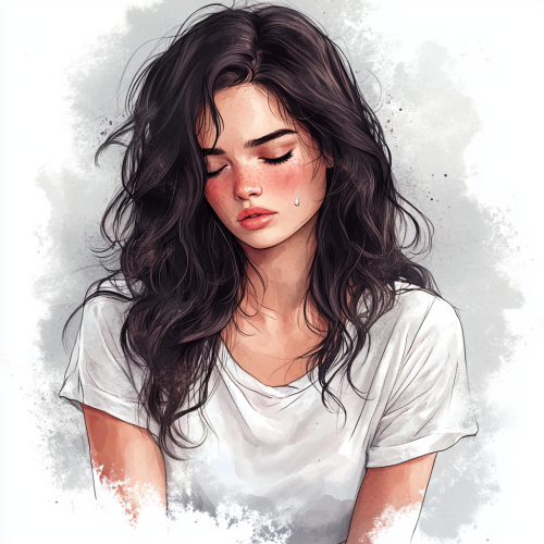 high detailed watercolor clipart of a beautiful girl, dark thick long hair, curls, falling to the side, beautiful soft makeup, girl sad, sensitive mood, hypersensitive, tears in the corner of the eyes, wearing a white beautiful cotton tight t-shirt, black leggings, soft colors , beautiful illustration with realistic details, high resolution, gray background