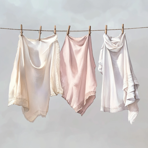 highly detailed photorealistic watercolor clothesline drying beautiful clothes, soft light, white and light soft pastel pink color, soft colors, beautiful illustration with realistic details, luxury aesthetic, high definition, gray background