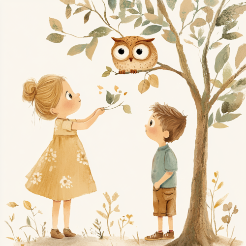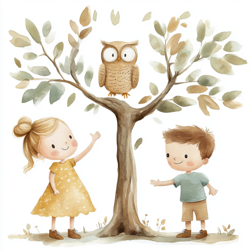 cute girl (with blond hair bun, monochrome yellow dress, brown shoes, smiling, 2 arms with each 5 fingers) and a little boy (with brown hair, a blue short pants, a green dottet shirt, brown white shoes, 2 arms with each 5 fingers), boy and girl looking to an owl sitting on a high tree with green leaves, soft watercolor, white background