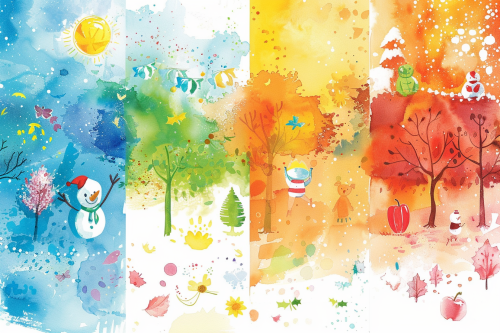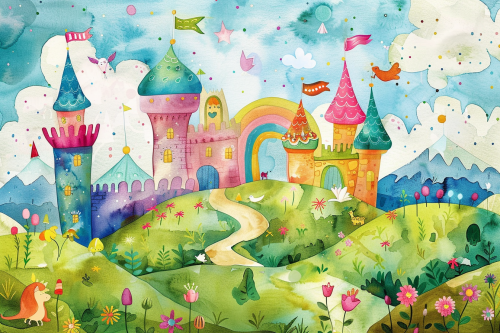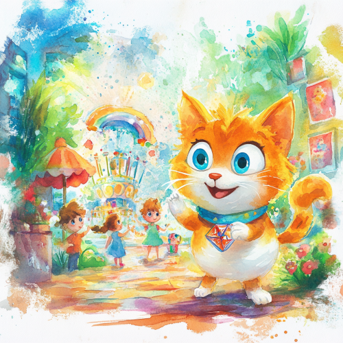 Create a vibrant watercolor illustration that captures the essence of 'Tango și Aventura Hărții Magice,' a children’s story set in Veranda Mall. The image should feature Tango, a friendly and playful cat mascot with golden-orange fur, white paws, a white belly, big turquoise-blue eyes, and a cheerful smile. Tango wears a colorful scarf around his neck with bold, vibrant blocks of red, green, blue, yellow, and orange, inspired by the Veranda Mall logo. In the illustration, Tango is joyfully leading a group of children through a magical adventure inside the mall. The scene should include elements from the story: Tango holding a glowing, enchanted map with magical symbols, a talking fountain with water sparkling in the sunlight, and animated toys from the toy store coming to life. The background should show a whimsical mall setting with a lively carousel and a hidden playground, filled with colorful flowers and greenery. Include a rainbow tree with multicolored leaves in the center, symbolizing the final destination of the adventure. Tango is playfully interacting with the children, who are smiling and excited, holding their own treasure maps and small paintbrushes, ready to bring their drawings to life. The overall composition should be bright, joyful, and full of wonder, with soft watercolor brushstrokes creating a dreamy, magical atmosphere perfect for a children’s book illustration.