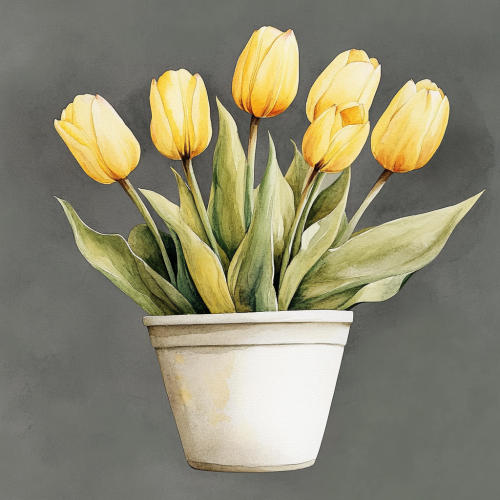 highly detailed watercolor clipart of beautiful yellow tulips in a white beautiful flower pot, soft colors, beautiful illustration with realistic details, luxury aesthetic, high resolution, gray background