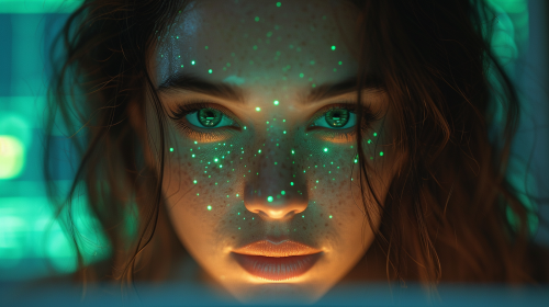 A girl in a beautiful office solves her financial problems with the help of green technological robots, unreal engine, fashion, photorealism --v 6.0 --ar 16:9 --s 750