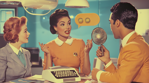 A vibrant, modern tech company office with enthusiastic employees engaging in dynamic discussions. The office should have a sleek design with advanced tech gadgets, large monitors, and collaborative workspaces. Showcase a diverse group of tech professionals, including both men and women, focused on innovation and teamwork.