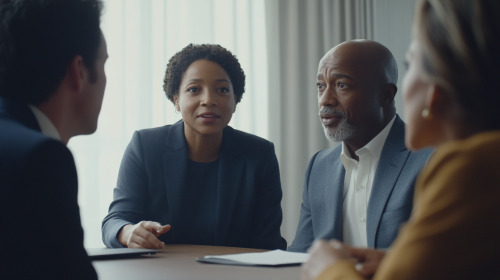 Cinematic close-up of a thoughtful leader gazing outward with a calm expression, in a bright, open office space, guiding a diverse group of individuals towards success. Asymmetrical composition with subtle leading lines directing attention towards the group in the background, each person thoughtfully positioned in conversation. Natural ambient light streaming from large windows creates soft shadows, enhancing a sense of focus and inspiration. Balanced colors with subtle tonal harmony, medium depth of field to keep leader in sharp focus while the background gently blurs Canon 1D X, 35mm lens, Kodachrome film stock, --ar 1:1 --s 500