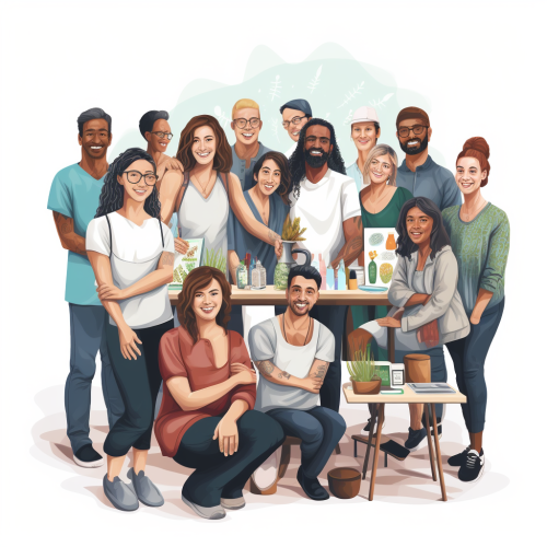 diverse people in a modern office with large glass windows and plants on the desk with the people dressed casually