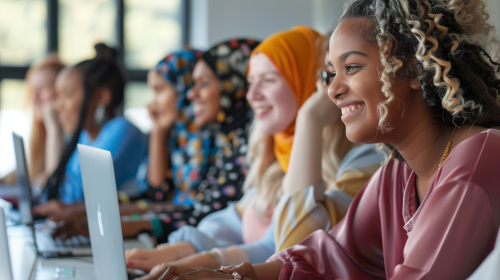 group of diverse young people smiling and laughing and working on their laptops in a bright white office with colorful neon, photo taken on a DLSR --ar 12:5