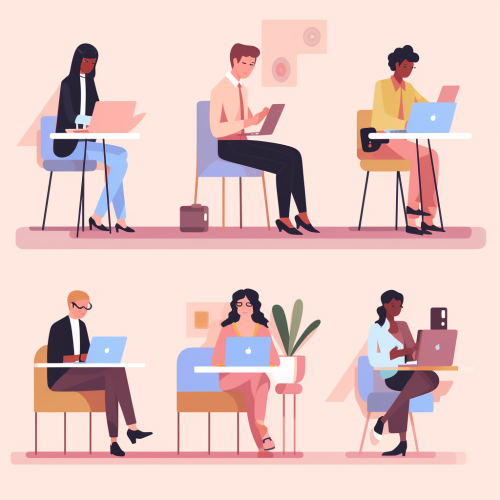 flat design in pastel colours of people working and thinking with screens and laptops
