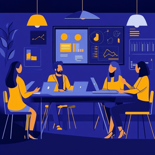 Top view of a small team of 5 working together around a round table, vector illustration with a white background. The design is simple, with flat colors and shading, in a vector art style. The edges are white and isolated, with a white background and white space in the center of the canvas. The overall style is a colorful cartoon with a minimalistic approach.