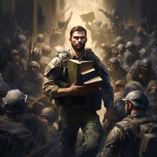 lots of angry soldier ,holding books are going toward a wall and one of them is looking back to the camera