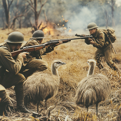 Australian soldiers in 1930s military uniforms and gear, including helmets and boots, are positioned across the field. Soldiers should be shown firing machine guns, with bullets and shell casings scattered around. Capture the intense action and the soldiers’ frustration as they attempt to control the emus.