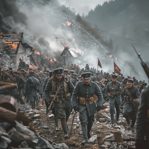 A historical depiction of Germany's army during World War 2, marching through the diverse landscapes of Europe. Alongside the soldiers in their distinct uniforms, tanks roll forward, showcasing the military machinery of the era. The backdrop captures the varied terrains of Europe, from its bustling towns to its serene countryside, all under the shadow of the war. 4k realistic style --ar 3:2 --v 5.1
