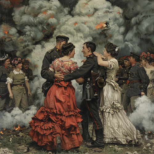 soldiers exchanging diverse women with smoke and fire seen in the background