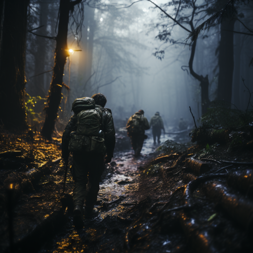 Generate an image of the moment when some Austrian soldiers mistake the internal conflict for a Turkish raid, leading to confusion and panic. Cinestill 800T, Canon Eos 5D Mark IV