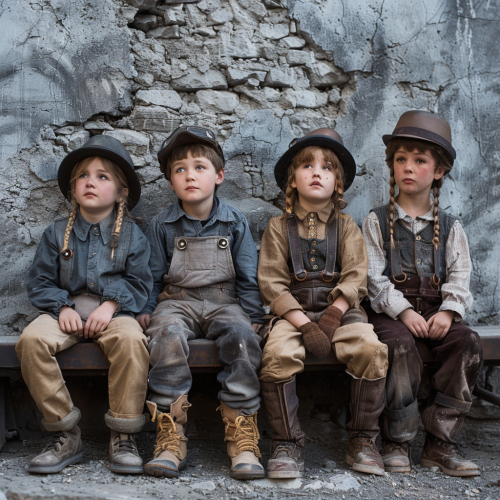 kids dressing up as 1890 mine workers, not smiling, sitting on a bench, 4 kids. realistic. Background lime stone wall.