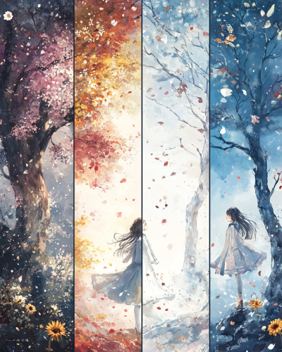The screen is divided into four parts. The first one is spring with cherry blossoms blooming, the second one is summer with sunflowers blooming, the third one is autumn with autumn leaves, and the fourth one is winter with snow falling. Each one has a girl in it, watercolor style, anime style illustration. --ar 4:5