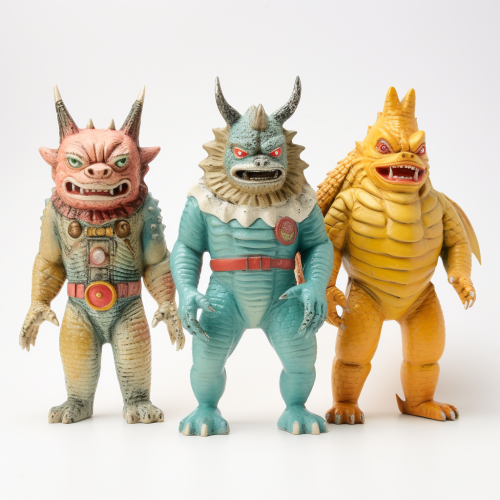 3 different sized 1960s vintage japanese sofvi kaiju figures, different manufacturers, injection molded plastic, waxy plastic, worn paint, worn, lightly scratched, vibrant color on white background --v 5.2