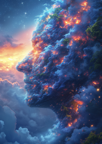 Kaelios, a god of a new mythology with the power of creation, stands majestically on top of a mountain in an unknown and inaccessible divine realm. He has a hardened and mischievous expression, embodying the essence of a powerful and enigmatic deity. His arms are extended outward as he molds humans from clay or light, the figures emerging and taking shape in his hands as if they were being sculpted by divine will. The scene is illuminated by dramatic flashes of divine lightning, casting stark shadows and adding intensity to his act of creation. The background is a vast, otherworldly landscape with swirling clouds, celestial bodies, and distant ethereal structures that defy earthly understanding. The overall atmosphere is mysterious and mystical, evoking the grandiosity and awe of ancient mythologies like Greek and Egyptian. The lighting is intense and contrasts sharply with Kaelios's features, emphasizing his power and control. The image is in a 16:9 ratio, capturing the expanse of this divine setting and the dramatic moment of creation. --ar 16:9