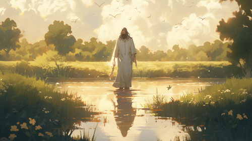 Scene 2: The Divine Apparition When passing through the portal, Mario and Luigi saw a lush landscape, with majestic mountains and crystal clear rivers. They came across a figure shrouded in an aura of peace and wisdom. It was Jesus, who welcomed us with a warm smile.