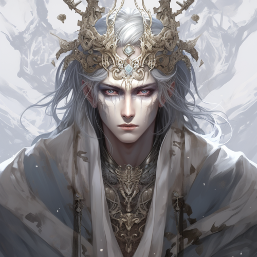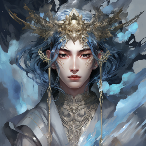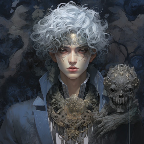[825d9634f] The Death God, known as 飞龙 (Fei Long) in Chinese, is a male deity in the divine realm. He is depicted as a handsome young man with youthful and beautiful characteristics, often associated with eerie beauty. The deity is recognizable by his grey-blue eyes and an exquisite skull accessory, reminiscent of Zhang Ruoxin's appearance. This portrayal bears a strong resemblance to the concept of the Death God Ryuk, incorporating elements such as diamonds, Jesus, and the 趐人 (Yue Ren) and dragonfly. --v 5.2 --ar 1:1 --c 0 --style raw