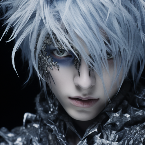 [7936a57c6] Blue eyes, grey-blue pupils, sickly beauty, male model, beautiful youth. His name is Grey, the god of death. High-end skull accessories, black leather jacket, stunning beauty. God's perspective. Zhang Ruoxin. --v 5.2 --ar 1:1 --c 0